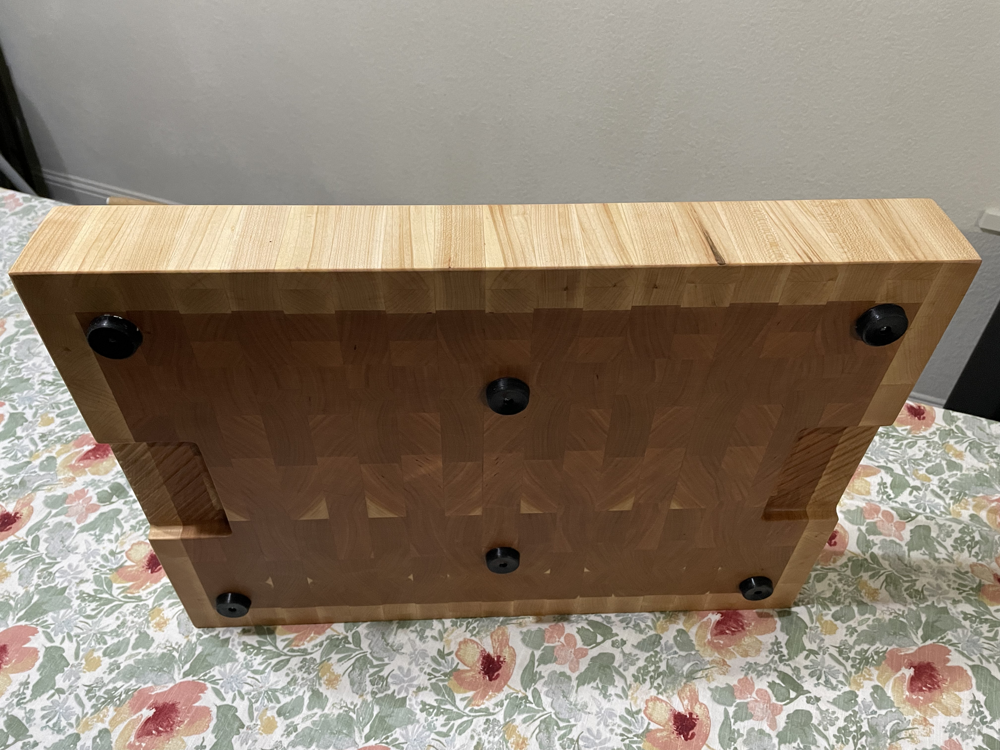 End Grain Cutting Board made from Cherry Wood with textured handle and rubber feet to increase stability and allow airflow to help prevent warp from uneven drying.